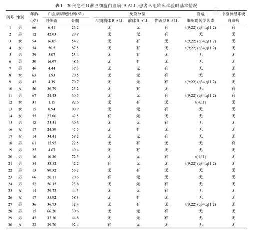 30例急性B淋巴细胞白血病(B-ALL)患者入组临床试验时基本情况