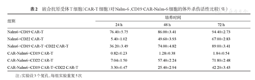 CD19 CAR-T细胞转染率为(72.3±6.0)%,CD22 CAR-T细胞转染率为(57.2±4.2)%,CD19 CAR-Nalm-6细胞转染率为(46.5±3.8)%。