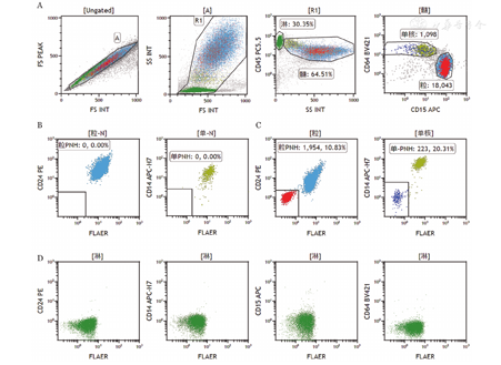 | 单核细胞 | FLAER | CD14 | CD15 | CD45 | CD64或CD33 | ||
