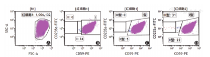 用磷酸盐缓冲液(PBS)对EDTA抗凝外周血样品进行1∶100稀释,取100 μl稀释后的血样分别加入对照管和检测管中,避免接触管壁。分别加入经滴定后确定的适量的CD235a-FITC和CD59-PE抗体,混匀,室温下避光孵育20 min。用PBS洗涤离心2次后加入PBS重悬细胞。立即上机获取细胞(注意超过15 min后,CD235a染色下降,并增加细胞的聚集)。获取至少10万个红细胞。如果在Ⅲ型PNH红细胞区域检测到少量异常细胞,应该继续采集样本达到高敏感的获取标准。目前国际上将红细胞检测的定量低限(LLOQ)达到0.01%时定义为高敏感检测。红细胞PNH克隆设门、分析过程参见图3。