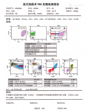 当粒细胞和红细胞的PNH克隆数>LLOQ时,按照定量结果报告,即报具体的PNH克隆比例。当红细胞或粒细胞PNH克隆>LOD,但<LLOQ时,则按照定性结果报告,即本次检测发现微量的PNH表型细胞,但数量较低,未到达定量的标准,建议定期复查。