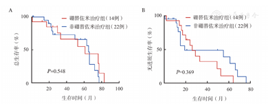 36例骨髓浆细胞比例<10%的MM患者中,初诊时有14例(38.9%)接受了以硼替佐米为基础的治疗方案[其中12例选用BCDT(硼替佐米+环磷酰胺+地塞米松+沙利度胺)方案或BCD(硼替佐米+环磷酰胺+地塞米松)方案,2例选用VRd(硼替佐米+来那度胺+地塞米松)方案],其他22例(61.1%)接受了以来那度胺、沙利度胺、美法仑、表柔比星、阿霉素或脂质体阿霉素、环磷酰胺等为主的其他治疗。14例以硼替佐米为基础治疗的患者中位PFS时间较其他22例患者延长(26.6个月对19.5个月,HR=2.084,95%CI 0.176~0.344,P=0.369);中位OS时间较其他22例患者缩短(61.7个月对65.5个月,HR=1.485,95%CI 0.620~0.691,P=0.548),但差异均无统计学意义(图3)。