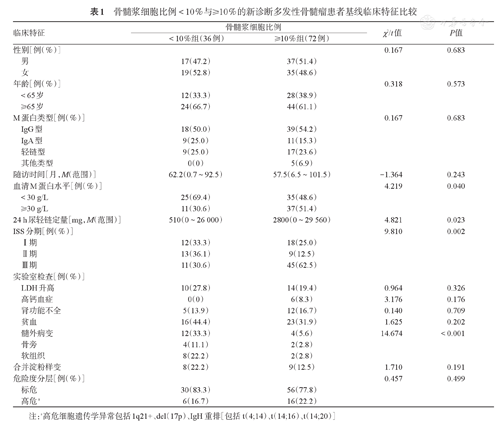骨髓浆细胞比例<10%与≥10%的新诊断多发性骨髓瘤患者基线临床特征比较