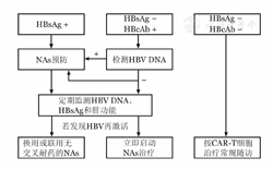 应仔细询问拟行CAR-T细胞治疗的血液肿瘤患者既往肝脏疾病史和用药治疗史。治疗前应常规筛查HBV血清学标志物(HBsAg、HBsAb和HBcAb)、HBV DNA和肝功能(ALT、天冬氨酸转氨酶、胆红素、白蛋白、凝血酶原时间等)。对于既往抗肿瘤治疗期间已预防性应用NAs的患者,仔细询问其既往NAs使用情况及抗肿瘤期间肝功能和HBV-DNA状况。