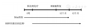 NAs:核苷(酸)类似物。a若未预防性使用NAs,HBV再激活的监测应持续至外周血B淋巴细胞恢复后12个月