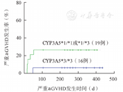 CYP3A5多态性倾向于成为影响allo-HSCT后严重(Ⅲ~Ⅳ度)aGVHD风险的因素之一,但不影响总体aGVHD发生率(表4,图1)。HSCT后共发生肾功能损伤3例,CYP3A5*1/*1或*1/*3组发生1例,CYP3A5*3/*3组发生2例,调整治疗后肾功能均获得改善。