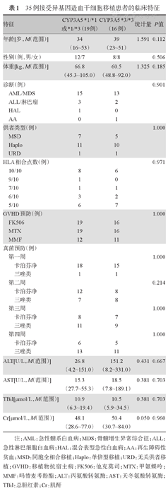 35例患者中19例至少携带一个CYP3A5*1等位基因,16例携带CYP3A5*3/*3基因型。两组在年龄、性别、体重、诊断、供者类型、干细胞来源、人类白细胞抗原(HLA)差异、预处理方案、GVHD预防、联合抗真菌药物及移植前天冬氨酸转氨酶(AST)、丙氨酸转氨酶(ALT)、总胆红素(TBil)及Cr水平方面差异均无统计学意义(P值均>0.05)(表1)。