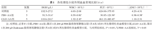 以正常雌性B6D2F1(F1)小鼠作为空白对照(对照组,3只),应用双磷酸盐(Clodronate)脂质体尾静脉注射的方法去除小鼠的巨噬细胞(CLO组,4只),以PBS脂质体处理小鼠为阴性对照(PBS组,4只)。并在注射脂质体后以全身辐照(TBI)联合异基因淋巴细胞输注的方法制备F1 AA小鼠模型,分别记为CLO+AA组和PBS+AA组。骨髓活检病理学检查、外周血细胞计数观察各组小鼠AA的程度;流式细胞术检测小鼠骨髓CD4+/CD8+ T淋巴细胞亚群和巨噬细胞亚群;ELISA法检测各组小鼠外周血血浆中IFN-γ、TNF-α、G-CSF、GM-CSF、TPO、EPO的水平变化。