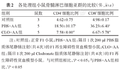 见表2。与对照组小鼠相比,PBS+AA组小鼠的CD4+和CD8+ T淋巴细胞比值均明显升高(P值均<0.05)。去除巨噬细胞后,相较PBS+AA组,CLO+AA组小鼠CD4+和CD8+ T淋巴细胞比例均显著降低(P值均<0.05),且CD8+ T细胞减少的程度更高。