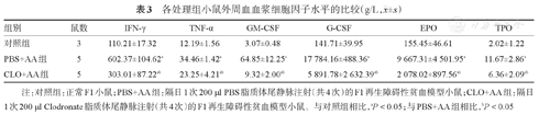 见表3。与对照组小鼠相比,PBS+AA组小鼠外周血血浆中IFN-γ、TNF-α、GM-CSF、G-CSF、EPO和TPO的水平均显著增高(P值均<0.05);与PBS+AA组相比,CLO+AA组小鼠外周血血浆中IFN-γ、TNF-α水平明显降低;正性造血调控因子GM-CSF、G-CSF、EPO和TPO水平也有所下降,但仍然显著高于对照组,差异均有统计学意义(P值均<0.05)。