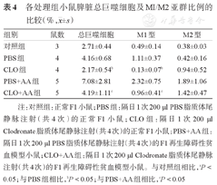 与PBS组相比,CLO组小鼠的脾脏总巨噬细胞比例明显下降,差异有统计学意义(P<0.05),提示脾脏中巨噬细胞的清除效果较为显著;且CLO组的M1型巨噬细胞比例显著降低,差异有统计学意义(P<0.05),M2型巨噬细胞比例差异无统计学意义。造模后,与PBS+AA组相比,CLO+AA组脾脏总巨噬细胞及M1巨噬细胞亚型均显著下降(P值均<0.01),降低程度与造模前差异均无统计学意义(表4)。