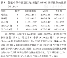 在4次脂质体注射完成后的第2天进行对照组、CLO组、PBS组的标本采集;在小鼠造模后第12天进行CLO+AA组和PBS+AA组的标本采集。摘眼球法取小鼠眶后静脉血1.0~2.0 ml,EDTA抗凝。处死小鼠后,无菌条件下摘取脾脏和左右股骨。脾脏置于200目尼龙滤网研磨制备成脾细胞悬液,再以小鼠淋巴细胞分离液分离获得单个核细胞。