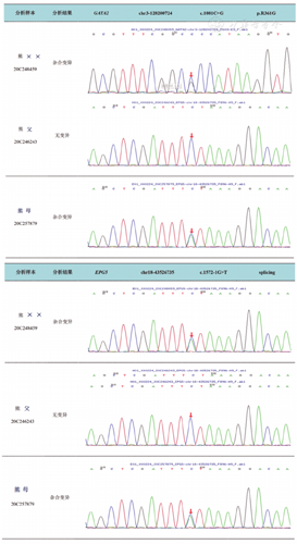 由于患者原发病诊断为MDS,在地西他滨治疗后再无化疗或免疫抑制治疗的前提下,反复高热、自发性多发软组织感染以及对广谱抗生素治疗无效等临床特征,考虑患者存在免疫缺陷可能。我们做了以下工作:(1)软组织感染处病灶活检排查微生物感染,结果提示为化脓性改变,组织培养未检出微生物;(2)送检患者免疫缺陷基因NGS检测,结果提示该患者存在多发基因改变,加送口腔黏膜检测,发现GATA2和EPG5为胚系来源(图1、图2);(3)针对该患者存在的突变,加做患者本人口腔黏膜检测发现其中GATA2和EPG5为胚系突变;对患者父母进行相关基因突变验证,结果发现其父亲存在GATA2同样位点缺失,母亲存在EPG5同样位点缺失(图2)。(4)为患者提供以下治疗方案选择:①脐血输注;②间充质干细胞输注;③小剂量供者造血干细胞输注。有鉴于患者经济原因以及现有条件考虑,选择为分次小剂量输注供者造血干细胞输注。因此,在2020年12月31日回输1份冻存干细胞,其中含单个核细胞(MNC)0.693×108/kg,CD34+细胞0.49×106/kg,此后于1月8日、1月22日、2月23日分次回输2份供者造血干细胞,回输MNC 1.38×108/kg,CD34+细胞0.98×106/kg。未出现明显移植物抗宿主反应(GVHR)。