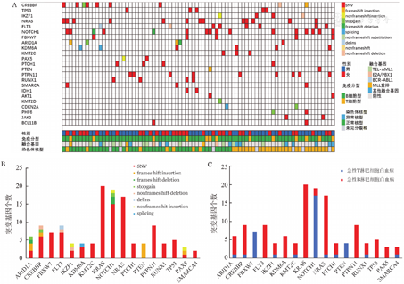 A:基因瀑布图(仅显示至少在2例以上患者中出现的突变基因),在上部表格中,每一行表示一个基因,每个颜色表示一种突变类型;B:17种最常见的基因突变位点及突变类型;C:不同免疫表型的常见突变基因。SNV:单核苷酸变异