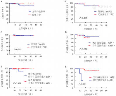 A:137例规范治疗ALL患儿的生存曲线;B:伴或不伴基因突变组无事件生存曲线;C:伴或不伴基因突变组的总生存曲线;D:伴或不伴Ⅰ类基因突变组的无事件生存曲线;E:融合基因阴性伴或不伴基Ⅰ类因突变组的无事件生存曲线;F:B-ALL患儿中伴或不伴TP53基因突变组无事件生存曲线