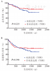 | 双表达组(75例) | 非双表达组(148例) | P值 | 双表达组(75例) | 非双表达组(75例) | P值 | ||