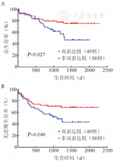 进一步对两组中接受R-CHOP方案治疗的患者进行亚组分析,分别有49例双表达患者与58例非双表达患者接受R-CHOP方案治疗,其中25例(51.0%)双表达患者和35例(60.3%)非双表达患者达到CR,差异无统计学意义(χ2=0.938,P=0.333)。两组3年OS率分别为(61.3 ± 7.5)%、(77.2 ± 5.6)%(χ2=4.892,P=0.027)(图2A);3年PFS率分别为(52.1 ± 7.5)%、(70.6 ± 6.0)%(χ2=4.201,P=0.040)(图2B)。R-CHOP方案治疗下双表达与非双表达两组的3年OS率、PFS率的差异均有统计学意义。