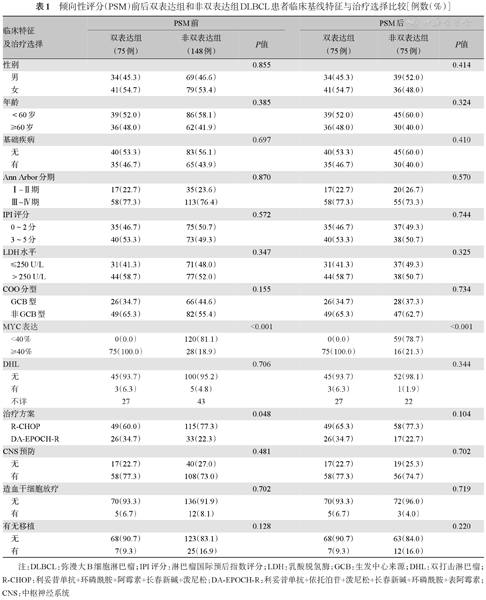 75例双表达组患者及148例非双表达组的临床特征及治疗选择资料见表1。其中两组仅在治疗方案方面的差异有统计学意义(P=0.048),而性别、年龄、有无基础疾病史、Ann Arbor分期、IPI评分、LDH水平等方面的差异无统计学意义。应用PSM根据性别、年龄、有无基础疾病史、Ann Arbor分期、IPI评分、LDH水平、COO分型、诱导化疗方案、CNS预防应用情况、移植、放疗等临床因素,按1∶1进行匹配,选择出75例非双表达的患者作为对照组,匹配后两组患者临床基线特征与治疗选择方面的差异均无统计学意义,具有可比性(表1)。