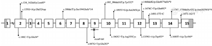 18例患者检测到16个PROS1基因杂合突变(表2),包括7个无义突变(c.100C>T/p.Gln34*、c.134_162del/p.Leu45*、c.847G>T/p.Glu283*、c.995_996delAT/p.Tyr332*、c.1359G>A/p.Trp453*、c.1474C>T/p.Gln492*和c.1680T>A/p.Tyr560*)、3个错义突变(c.155G>A/p.Gla52Asp、c.1063C>T/p.Arg355Cys、c.1095T>G/p.Asn365Lys)、3个移码突变(c.580delT/p.Ser194Glnfs*14、c.1460delG/p.Gla487Valfs*9、c.1747_1750delAATC/p.Asn583Wfs*9)、2个剪接位点突变(c.1493-17T>C、c.1871-1G>T)以和1个大片段缺失(外显子9缺失),以上突变在整个基因中的位置见图1。此外,在例10中检测到PROC基因c.565C>T/p.Arg189Trp杂合突变。