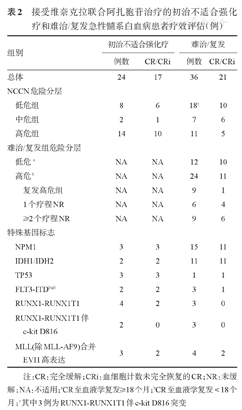 注:CR:完全缓解;CRi:血细胞计数未完全恢复的CR;NR:未缓解;NA:不适用;aCR至血液学复发≥18个月;bCR至血液学复发<18个月;c其中3例为RUNX1-RUNX1T1伴c-kit D816突变