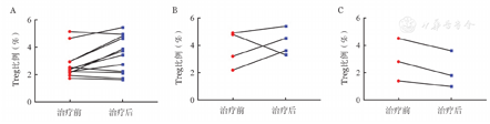 收集患者治疗前及治疗后6个月新鲜抗凝静脉血2 ml,流式细胞术检测CD4+CD25+Foxp3+ Treg比例,比较不同方案治疗前后Treg水平变化,并收集6例健康志愿者静脉血标本作为正常对照。