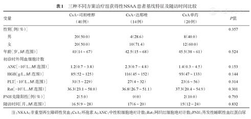本研究共纳入74例NSAA患者,其中男32例(43.2%),女42例(56.8%),中位年龄40(14~68)岁。CsA联合司坦唑醇治疗组40例(54.1%),CsA联合达那唑治疗组14例(18.9%),CsA单药治疗组20例(27.0%)。各组患者基线特征及随访时间差异均无统计学意义(P>0.05)(表1)。