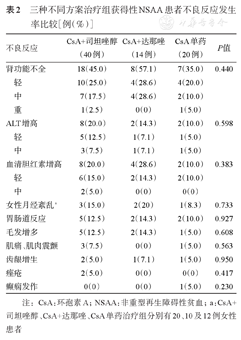 最常见的不良反应为肾功能异常(44.6%,33/74),其中仅2例(2.7%)患者因重度肾功能不全而换用其他治疗方案,其余患者经CsA减量后肾功能好转。肝功能异常发生于约20%患者中,其中ALT增高者占16.2%(12/74),胆红素增高者占18.9%(14/74),均为轻中度增高,经对症治疗后好转。其他较少见不良反应包括女性月经紊乱(16.7%)、胃肠道反应(12.2%)、毛发增多(10.8%)、肌痛/肌肉震颤(8.1%)、齿龈增生(5.4%)、痤疮(2.7%)等,经对症治疗或短暂停药后好转,三组患者不良反应比较差异均无统计学意义(表2)。