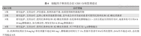 | 4级 | 密切监护,支持治疗,使用托珠单抗和(或)糖皮质激素,可予甲泼尼龙1 g/d静脉输注 |