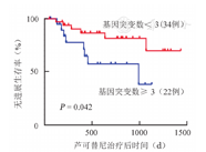根据患者携带的突变基因数量,我们将56例患者分为突变基因<3个(34例)及突变基因≥3个(22例)两组,两组初诊时各项指标基线临床数据差异均无统计学意义。经芦可替尼治疗后,两组患者的脾脏大小及MPN10评分均有明显好转(表2),其中突变基因≥3个组芦可替尼治疗后MPN10评分较初诊时明显下降[11.5(4~18)分对21.5(4~57)分,z=-3.411,P=0.001],治疗后脾脏长径较治疗前明显缩短[15.2(10.2~25.8)cm对16.0(10.4~27.0)cm,z=-4.117,P<0.001],表明芦可替尼对于突变基因≥3个的MF患者仍有改善体质性症状及缩小脾脏的效果。对比两组患者治疗后的脾脏大小发现,携带的基因突变数对芦可替尼缩脾作用无明显影响(H=0.000,P=0.993)(表2)。突变基因≥3个组中有4例患者治疗后骨髓纤维化程度较治疗前加重,而基因突变<3个组中有2例患者骨髓纤维化程度较治疗前加重,两组间差异无统计学意义(H=0.001,P=0.972)。突变基因≥3个组TTF及PFS明显缩短[356(55~1061)d对471.5(50~1270)d,z=-2.701,P=0.007;444(91~4109)d对1248.5(91~7061)d,z=-2.030,P=0.042]。PFS曲线见图1。