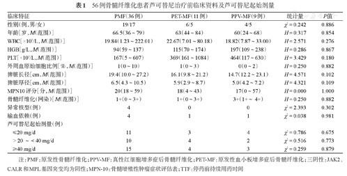 56例骨髓纤维化患者芦可替尼治疗前临床资料及芦可替尼起始剂量