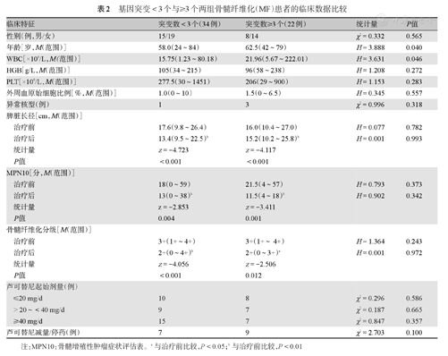 基因突变<3个与≥3个两组骨髓纤维化(MF)患者的临床数据比较