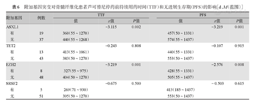 我们比较了携带/未携带高频率突变的附加基因(大于5例患者检出该基因突变)ASXL1、TET2、EZH2、SRSF2的患者芦可替尼治疗前后的临床资料,结果显示芦可替尼对于携带SRSF2突变的MF患者缩脾效果较差[治疗前13.6(10.0~21.4)cm,治疗后12.8(10.0~19.8)cm,z=-1.826,P=0.068],携带EZH2、SRSF2突变的MF患者症状改善效果较差[EZH2组治疗前、后MPN10积分分别为20.5(4~35)分、11.5(8~16)分,z=-1.825,P=0.068;SRSF2组治疗前、后MPN10积分分别为16(9~55)分、11(8~13)分,z=-1.761,P=0.078],携带ASXL1、EZH2、SRSF2突变的MF患者稳定骨髓纤维化作用较差(表5)。携带、不携带ASXL1突变患者TTF分别为360(55~1270)d、440(55~1268)d(z=-3.115,P=0.002),PFS分别为457(50~1331)d、574(55~1437)d(z=-3.219,P=0.001);携带、不携带EZH2突变患者TTF分别为327(55~975)d、404(50~1270)(z=-3.219,P=0.001),PFS分别为428(55~1331)d、505(55~1437)(z=-2.576,P=0.008);TET2、SRSF2突变对MF患者芦可替尼TTF、PFS无显著影响(表6)。