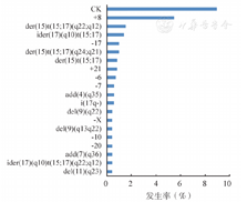 对715例初诊APL患者进行核型分析,其中93例(13.0%)为正常核型,443例(62.0%)仅有t(15;17),155例(21.7%)为t(15;17)伴ACA,24例(3.3%)为其他染色体数目和结构异常。如图1所示,t(15;17)伴ACA中最常见的染色体异常为+8(5.5%),其次为der(15)t(15;17)(q22;q12);而其中染色体数目异常以染色体丢失常见。复杂核型见于64例(9.0%)的患者。