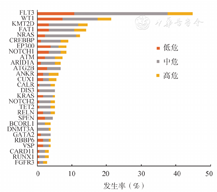 采用二代测序方法对178例患者进行基因突变检测,共检测出113个突变基因。发生率>1%的突变基因有75个。如图2所示,FLT3 (44.9%)为最常见的突变基因,其中FLT3-ITD见于20.8%的患者;其他较为常见的突变基因依次为WT1(21.3%)、KMT2D(14.6%)、FAT1(14.0%)、NRAS(12.4%)。