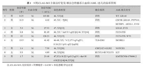 2019年2月至2021年7月南京医科大学附属儿童医院9例确诊为复发/难治AML的儿童患者纳入研究。AML的诊断标准依据2016年WHO髓系肿瘤和急性白血病分类修订版[3],根据骨髓细胞形态学、免疫学、细胞遗传学、分子生物学(MICM)确诊。复发性AML诊断标准:完全缓解(CR)后外周血再次出现白血病细胞或骨髓中原始细胞≥5%(除外巩固化疗后骨髓再生等其他原因)或髓外出现白血病细胞浸润。难治性AML诊断标准:经过标准方案治疗2个疗程无效的初治病例;CR后经过巩固强化治疗,12个月内复发者;12个月后复发但经过常规化疗无效者;2次或多次复发者;髓外白血病持续存在者。纳入标准如下:①符合复发/难治AML(除外M3)诊断标准;②年龄<18岁;③预期生存期≥8周;④与监护人充分沟通并获得同意,同时签署知情同意书;8岁以上儿童告知本人,并签署知情同意书。全部入组患儿均采用CLAG-M/I方案治疗。本研究得到南京医科大学附属儿童医院医学伦理委员会的批准(批件号:202004019-1)。