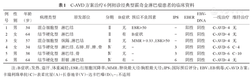 注:B症状:发热、盗汗、体重减轻;ESR:红细胞沉降率;MMR:肿块最大径/胸腔最大径;IPS:国际预后评分;EBV:EB病毒;C-AVD方案:卡瑞利珠单抗(C)+表柔比星(A)+长春地辛(V)+达卡巴嗪(D);-:不适用