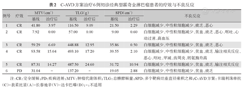 全部6例患者中,C-AVD方案治疗结束后5例获得完全缓解(CR),1例(例5)应用C-AVD方案2个周期后获得CR,但在治疗4个周期后发生疾病进展。客观反应率(ORR)和CR率均为83.3%。所有获得CR的患者截止到末次随访仍维持CR状态。全部患者基线MTV及TLG平均水平分别为53.49 cm3和290.03 g。一线治疗结束时,所有获得CR的患者SPD减轻超过50%,MTV和TLG较基线下降超过80%(表2)。