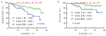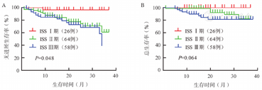 16例(10.7%)患者死亡,32例(21.3%)患者疾病进展或复发,中位PFS和OS时间均未达到,3年PFS率为59%,3年OS率为83%。遗传学高危、标危患者的2年PFS率分别为65%和83%,2年OS率分别为77%和91%。遗传学高危患者的中位PFS时间较标危患者缩短(33个月对未达到,P=0.014),中位OS时间的差异无统计学意义(均未达到,P=0.072)(图1)。ISS Ⅰ期、Ⅱ期和Ⅲ期患者的2年PFS率分别为96%、77%、73%(P=0.048);2年OS率分别为100%、92%、81%(P=0.064)(图2)。R-ISS Ⅰ期、Ⅱ期和Ⅲ期患者2年PFS率分别为100%、81%和54%(P=0.002);2年OS率分别为100%、90%和74%(P=0.005)(图3)。