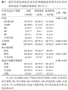 | 疗效及造血干细胞采集 | 总体(150例) | 高危患者(38例) | 标危患者(109例) | χ2值 | P值 | |