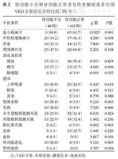 | 不良事件 | 肾功能不全(48例) | 肾功能正常(102例) | χ2值 | P值 | |