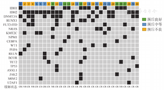1个疗程VEN联合用药治疗后评估,30例患者中CR 22例(73.3%),CRi 2例(6.7%),PR 1例(3.3%),NR 5例(16.7%),ORR为83.3%(25/30)。16例初治患者CR 15例(15/16),PR 1例(1/16);9例复发患者CR 5例(5/9),NR 4例(4/9),需要注意的是,1例移植后复发患者在VEN治疗后再次获得CR;5例难治患者CR 4例(4/5),NR 1例(1/5)。初治患者的ORR高于复发/难治患者(100%对64.3%),差异有统计学意义(P=0.014)。IDH1突变患者的ORR与IDH2突变患者相近(90.9%对83.3%,P>0.05)。进一步分析发现,IDH突变不伴FLT3-ITD突变组的ORR高于IDH、FLT3-ITD共突变组(87.5%对66.7%),差异无统计学意义(P=0.186);同样的结论也在IDH不伴RUNX1突变组与IDH、RUNX1共突变组得出(87.0%对71.4%,P=0.565)。而IDH、DNMT3A共突变组的ORR与不伴DNMT3A突变组的ORR率相近(78.6%对87.5%,P=0.642)。此外我们发现预后良好组、预后中等组与预后不良组的ORR率差异无统计学意义(分别为71.4%、100.0%、75.0%,P>0.05)(图1)。