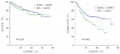 410例DLBCL患者中接受系统治疗的可随访患者367例,中位随访时间为18(0~75)个月,1年、3年、5年OS率分别为89.6%、85.9%、82.8%,1年、3年、5年PFS率分别为81.2%、72.5%、71.1%。其中154例DEL患者1年、3年、5年OS率分别为87.7%、83.8%、81.8%,1年、3年、5年PFS率分别为77.9%、68.2%、65.6%。213例非DEL患者1年、3年、5年OS率分别为91.1%、85.9%、83.6%,1年、3年、5年PFS率分别为83.6%、75.6%,75.1%。DEL与非DEL患者PFS率的差异有统计学意义(P=0.002),OS率的差异无统计学意义(P=0.226)(图2)。