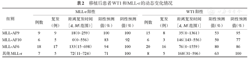 对100例接受造血干细胞移植的患者移植后的WT1和MLL-r的动态变化进行分析,结果见表2。MLL-AF9组,WT1预测复发的阳性和阴性预测值分别为53%和95%。26例患者的MLL-r持续阴性,未观察到复发。MLL-r预测复发的阳性和阴性预测值分别为100%和100%。7例WT1转阳(0.72%~1.4%)并且MLL-r阴性的患者,未出现复发。