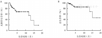 最常见的3~4级不良反应为血液系统的中性粒细胞减少、血小板减少和贫血。65例患者存在3~4级粒细胞减少,其中46例(70.8%)在治疗前即存在,19例(29.2%)在治疗期间出现,中位中性粒细胞恢复时间为31(0~94)d。61例患者存在3~4级血小板减少,其中41例(67.2%)在治疗前即存在,20例(32.8%)在治疗期间出现,中位血小板恢复时间为27(2~94)d。60例患者存在3~4级贫血,其中45例在治疗前即存在,15例(25.0%)在治疗期间出现。62.1%(41/66)的患者发生粒细胞减少性发热。