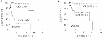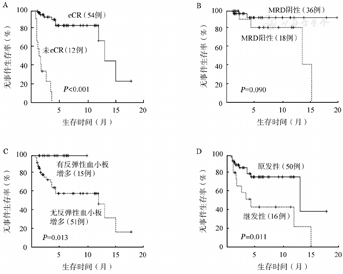 中位随访时间为4.25(0.9~19.9)个月,总体的中位EFS时间为13.2(3.7~22.7)个月,中位OS时间为15.3(0.9~19.9)个月(图1)。共死亡9例,其中30 d内死亡1例,系合并重症胰腺炎的42岁男性,死于消化道出血所致失血性休克,30 d死亡率1.5%。60 d内死亡2例,另1例为72岁男性患者,诊断时存在肺间质纤维化,死于重症肺炎呼吸衰竭,60 d死亡率3.0%。14例患者获得CR后评估综合情况适合标准化疗,调整为中大剂量阿糖胞苷方案巩固治疗,2例患者桥接异基因造血干细胞移植,截至随访截止,除1例患者死亡外,其余患者均处于无复发生存中。CR患者的中位EFS及OS时间明显长于未达CR患者(P均<0.001)(图2)。cCR患者及MRD阴性患者的中位EFS时间显著长于未达cCR患者(P<0.001,P=0.039),出现反弹性血小板增多患者的中位EFS时间较无反弹性血小板增多患者显著延长(P=0.013),原发AML较继发AML患者的中位EFS时间更长(P=0.011)(图3)。NPM1突变亚组、DNMT3A突变亚组中位EFS时间较无相应突变亚组延长:有无NPM1突变两组中位EFS时间分别为未达到和12.1个月(P=0.024),有无DNMT3A突变两组中位EFS时间分别为未达到和12.1个月(P=0.039)。TET2突变亚组相比无相应突变亚组的中位EFS时间明显缩短:有无TET2突变两组中位EFS时间分别为3.4个月和13.2个月(P=0.025)。