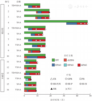 注 TD-NSAA:输血依赖非重型再生障碍性贫血;SAA:重型障碍性贫血;VSAA:极重型再生障碍性贫血;IST:免疫抑制治疗;rhTPO:重组人血小板生成素;EPAG:艾曲泊帕;HPAG:海曲泊帕;APAG:阿伐曲泊帕;CR:完全治疗反应;GPR:良好治疗反应;PR:部分治疗反应;HI-P:血小板反应;HI-N:中性粒细胞反应;NR:无治疗反应