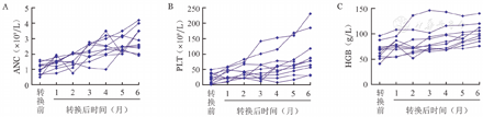 11例APAG转换治疗后获得HR患者,外周血细胞计数多在转换治疗后1个月即开始明显改善,至转换治疗6个月过程中血常规变化见图2,ANC中位数由1.05(0.49~1.61)×109/L提升至2.9(1.9~4.2)×109/L;PLT中位数由20(1~49)×109/L提升至96(30~231)×109/L;HGB中位数由66(41~96)g/L提升至102(76~140)g/L。