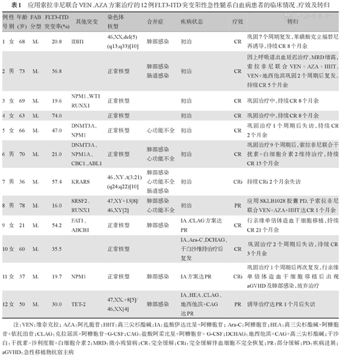 应用索拉非尼联合VEN、AZA方案治疗的12例FLT3-ITD突变阳性急性髓系白血病患者的临床情况、疗效及转归