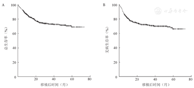 所有患者移植后3年OS率为(73.10±1.90)%,DFS率为(70.80±1.90)%,CIR为(19.43±1.67)%,NRM为(9.80±1.24)%。Ⅱ~Ⅳ度、Ⅲ/Ⅳ度aGVHD累积发生率分别为(33.96±1.87)%、(13.08±1.33)%,3年中重度cGVHD、重度cGVHD累积发生率分别为(35.10±2.14)%、(10.66±1.38)%。生存曲线见图1、图2。