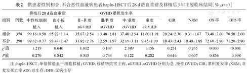 供患者性别相合、性别不合组haplo-HSCT后28 d累积中性粒细胞植入率、血小板植入率差异无统计学意义(P=0.270,P=0.842),Ⅱ~Ⅳ度、Ⅲ/Ⅳ度aGVHD累积发生率及移植后3年OS率、DFS率、CIR、NRM及cGVHD累积发生率差异均无统计学意义(P>0.05),详见表2。